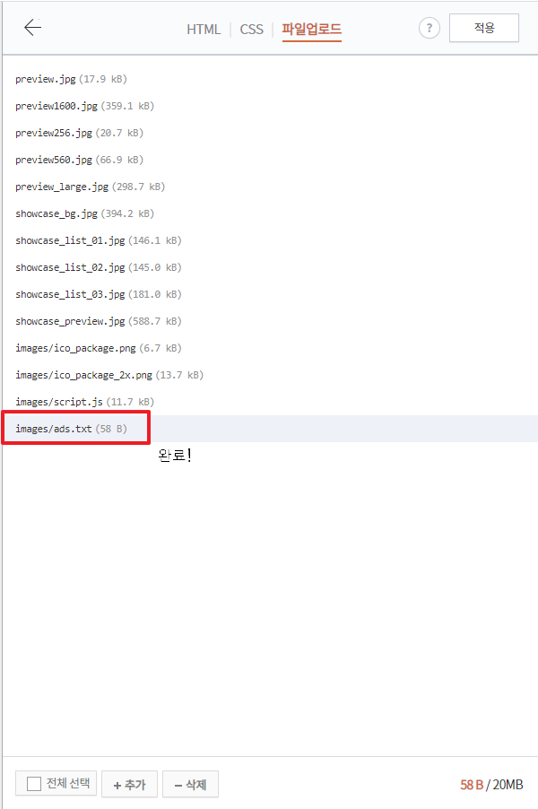 ☞ 하단에 +추가 탭을 눌러주세요. 아까 다운받았던 메모장을 업로드해주세요.(+ ads.txt 파일)