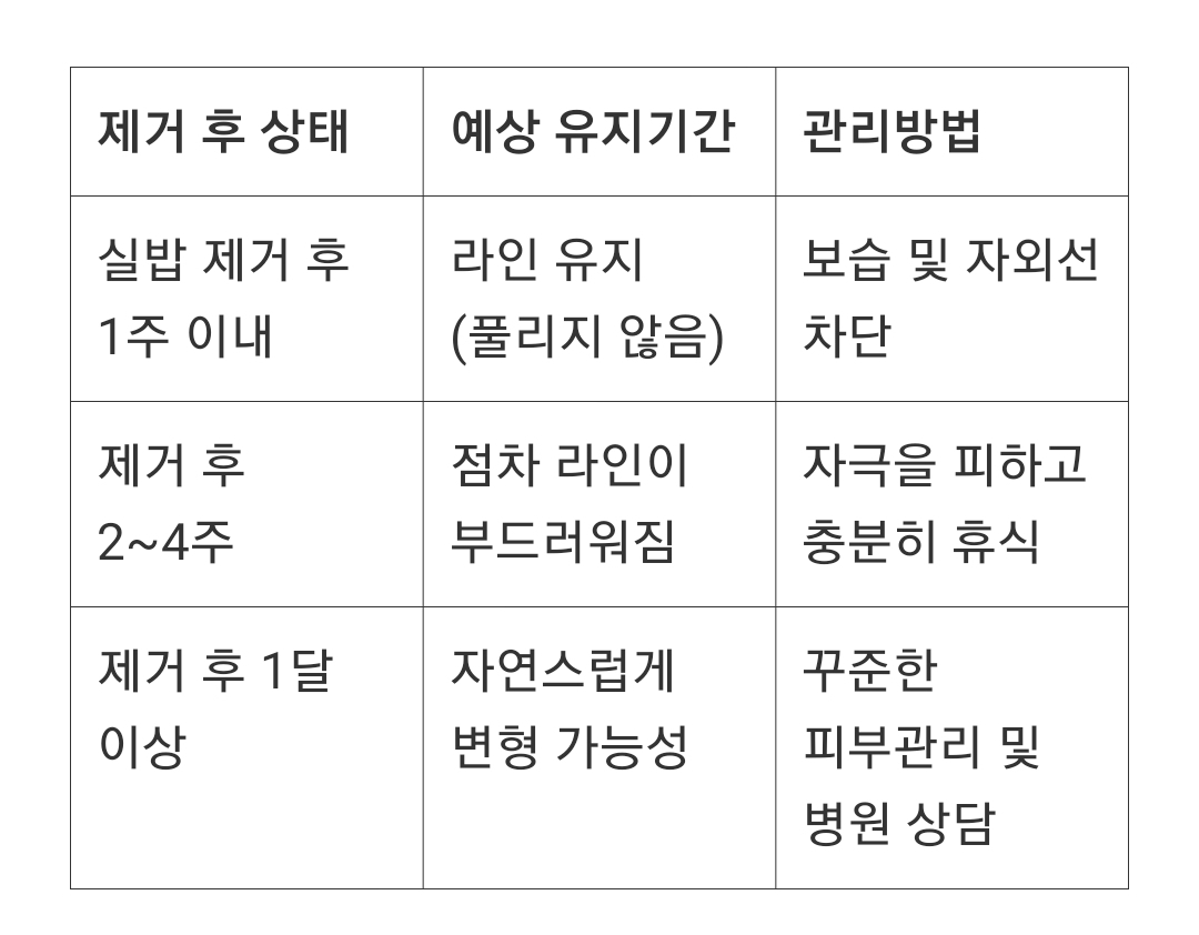 꾸준한 보습: 수술 후 피부는 민감하고 건조해지기 쉽습니다. 보습을 충분히 해주면 피부가 더 빨리 회복될 수 있습니다.