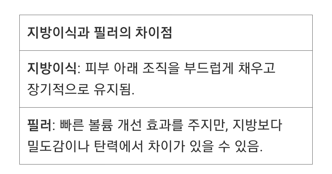 지방이식을 원하지 않는 분들은 추가 필러 주입이나 레이저 탄력 시술로 탄력을 보완하는 방법도 있습니다. 하지만 이는 일시적인 효과일 수 있으니 장기적인 개선을 원한다면 지방이식을 고려해볼 만합니다.