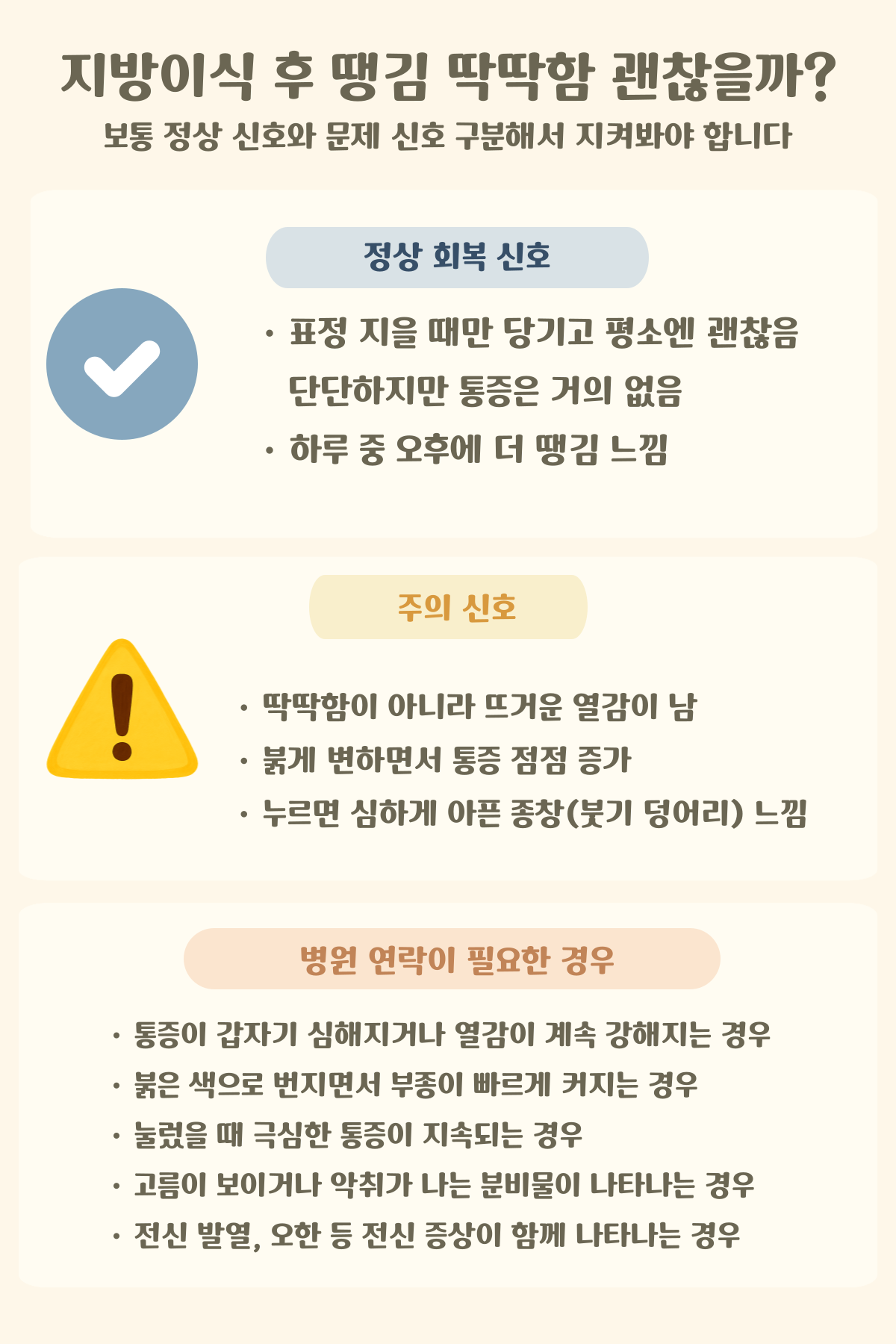 - 지방이식 후 땡김·딱딱함은 초기 회복 과정에서 가장 흔한 정상 반응입니다.