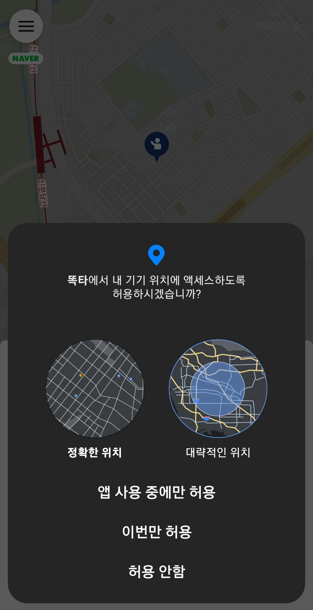 ✔️ 똑타에서 내 기기 위치에 액세스 하도록 허용한뒤, 출발지와 도착지를 입력합니다.