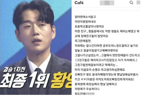 3월 1일에 황영웅의 동창이라고 주장하는 한 네티즌의 생생한