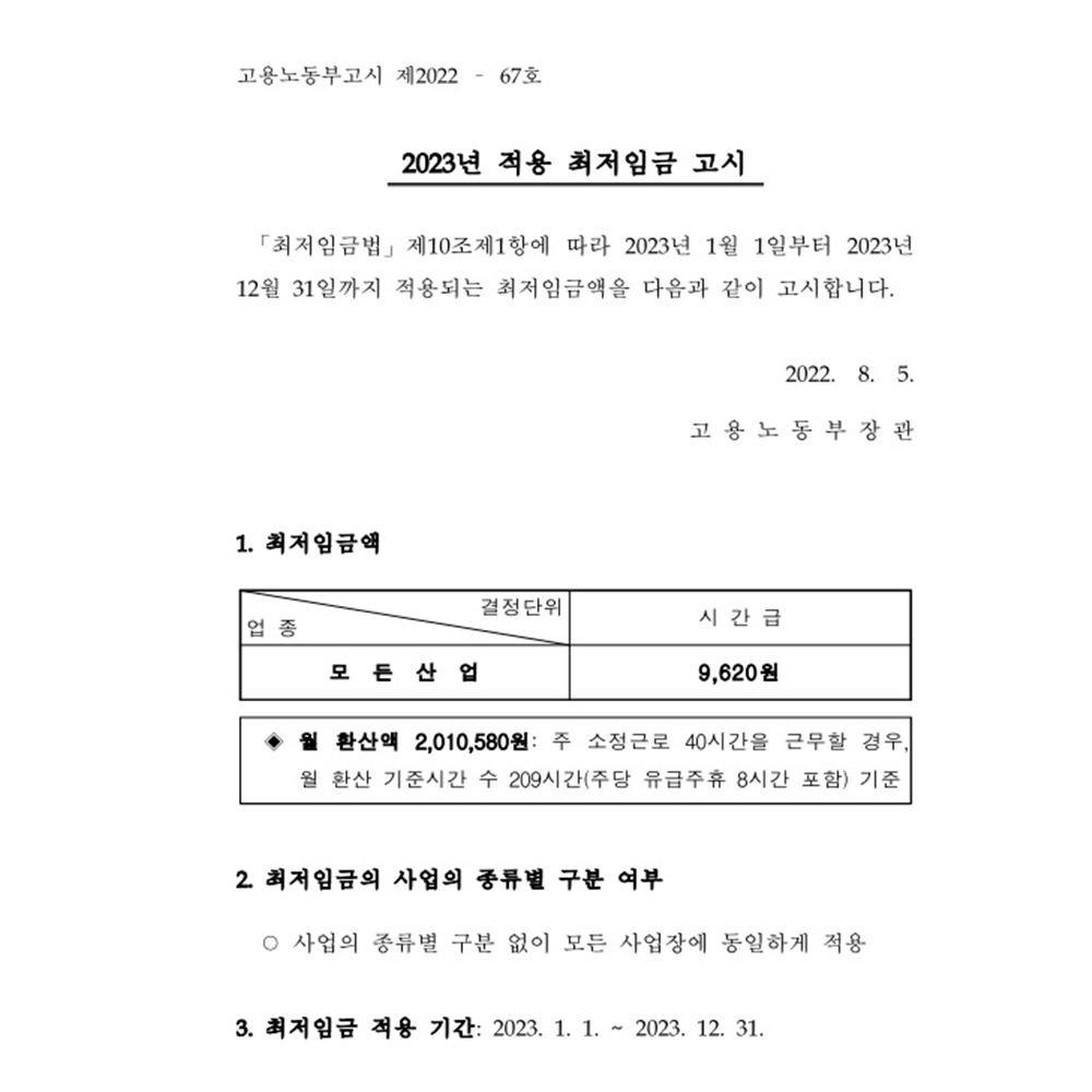 | 2023년 | 9,620원 (2022 대비 5.0% 인상) | 2,010,580 원 |