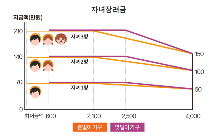 - 최대 지급액|자녀 1인당 70만원(최소 50만원)