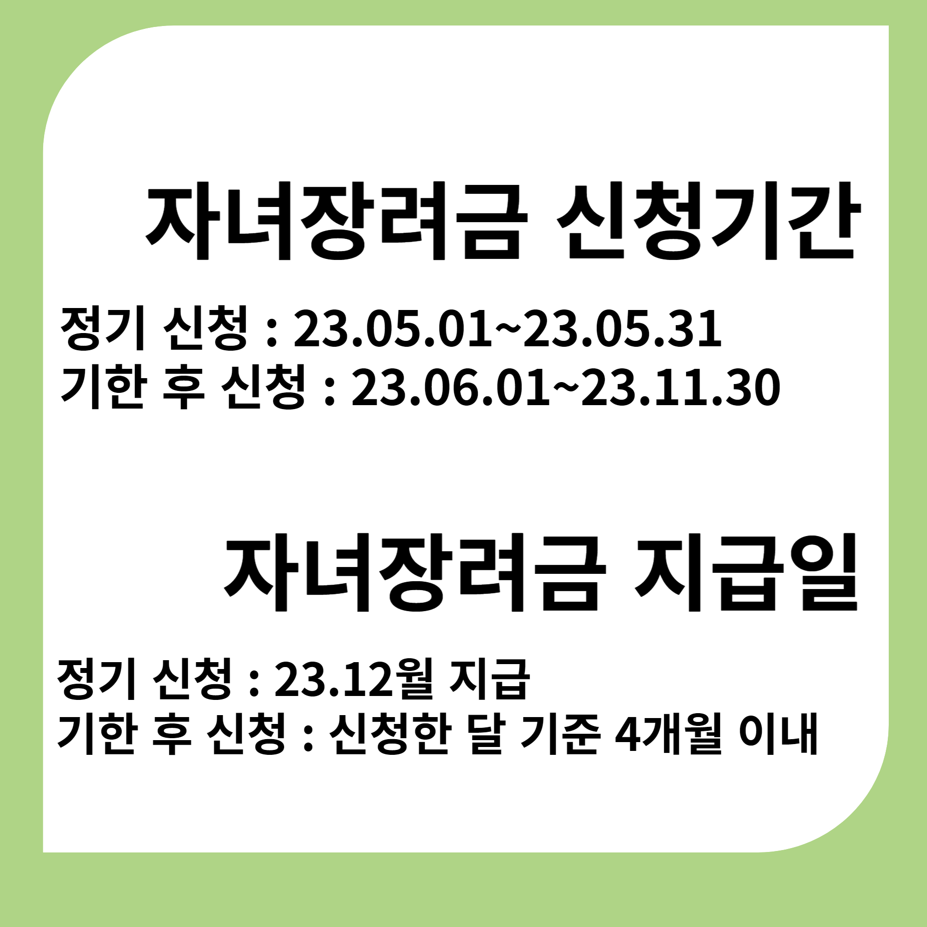- 지급일|정기 : 23.12월 지급|기한 후 신청 : 신청한 달을 기준으로 4개월 이내 지급